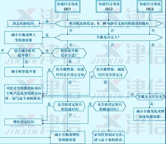 富士變頻器OC報警時,并不意味著一定是變頻器出現(xiàn)了故障,有可能是由于某些設定或者干擾導致,當然也有可能是由于部件異常,常見判斷故障原因和解決的步驟如下: