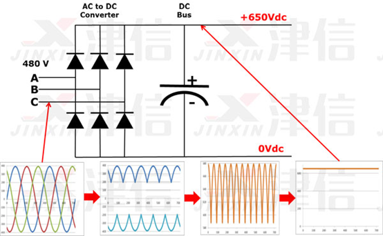 我們假設(shè)驅(qū)動器在480V電源系統(tǒng)上運行。480V等級為均方根。480V系統(tǒng)的峰值為679V。如您所見,變頻器直流總線具有帶交流紋波的直流電壓。電壓在大約580V和680V之間。