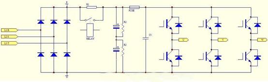 我們須畫出主回電路圖來(我們將交流-直流-交流稱作變頻器的主回路,如圖一),IGBT模塊燒毀往往是因?yàn)槟K被錯誤觸發(fā),而導(dǎo)致直流母線經(jīng)模塊短路,燒毀IGBT逆變模塊,進(jìn)而燒毀保險(xiǎn)以及整流模塊,如象西門子MM430系列變頻器沒有配置保險(xiǎn),IGBT模塊燒毀,在我們所維修的機(jī)器中,整流模塊無一幸免都被燒毀。
