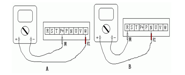 在通用變頻器的整流模塊輸入端子R、S、T及直流端子P、N上,用萬用表電阻檔測量如圖1變頻器主回路。