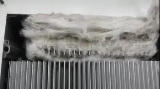 紡織行業(yè)和玻璃纖維行業(yè),粉塵以絨毛和纖維的形式出現(xiàn),生產(chǎn)過程中產(chǎn)生的微小的毛經(jīng)由變頻器的氣流通道進(jìn)入到設(shè)備的內(nèi)部。而且由于絨毛相較于塵埃的更大的雜物,會更容易夾在散熱器或空氣過濾器上,或是纏在風(fēng)扇上。同時(shí)由于絨毛的特性會更容易吸引其它的纖維纏繞其上,這樣的情況在嚴(yán)重的狀態(tài)下幾乎可以完全阻塞變頻器的空氣流動通道。