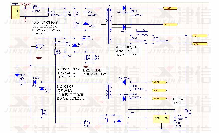 到此雖然檢修過程結(jié)束,但工作并未完成:此電源板電路是LG IS5 系列幾千瓦到幾十千瓦變頻器的通用CPU 電源板,故繪出此電路圖并標(biāo)注出某些元件的參數(shù)及代換型號(hào)。當(dāng)以后遇到同樣的機(jī)器時(shí),在找不到原型號(hào)可找代換的,如果連代換的也找不到的話就以能購(gòu)置到且性能最相近的元器件裝機(jī)。更重要的是,不再怕被別人修過的同型號(hào)“轉(zhuǎn)修機(jī)”,即我們行內(nèi)常說的“同行機(jī)”——丟失或是換錯(cuò)元器件的機(jī)子。