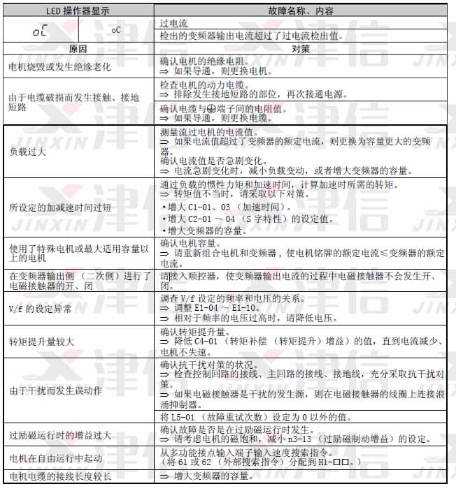 1. 自由運行中或急減速后,電機中還殘留有感應電壓又重啟運行 2. 變頻器發生硬件故障 |